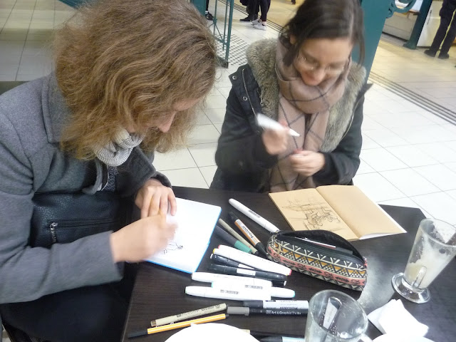 Téma tehát adódott elegendő, ezért is gyűltek össze nyolcan. Én sajnos nem vehettem részt, mer épp aznap délelőtt segítettem feltenni a MiniArtTura képeit az ARTICUM Galériában (megtekinthető egész decemberben éjjel-nappal, mert a galéria kirakata ki van világítva). Most is volt külföldi vendégünk Magdalena French személyében. Horváth Izabella először rajzolt velünk. A kellemes napsütés a szabadba csalogatta a rajzolókat.